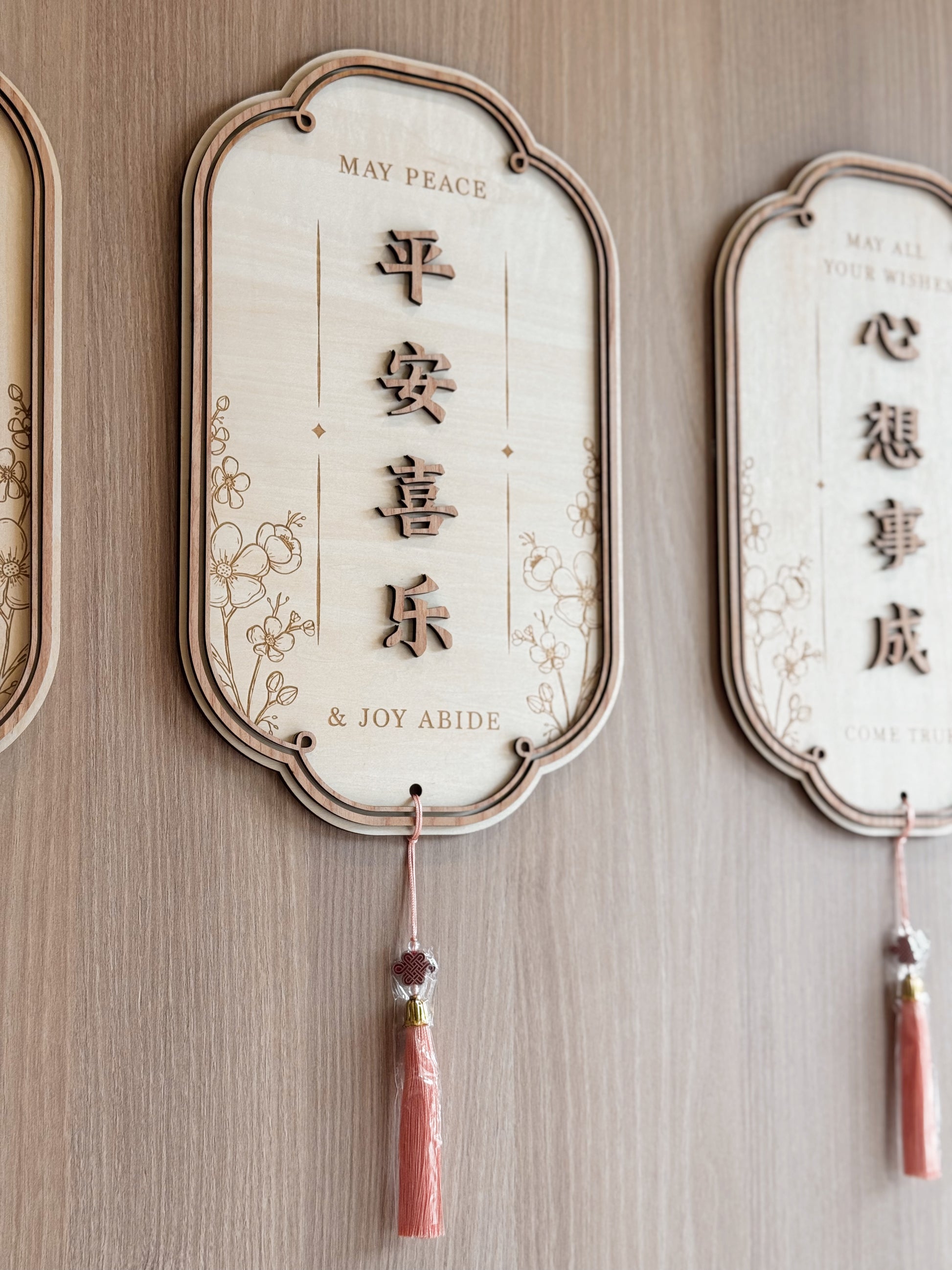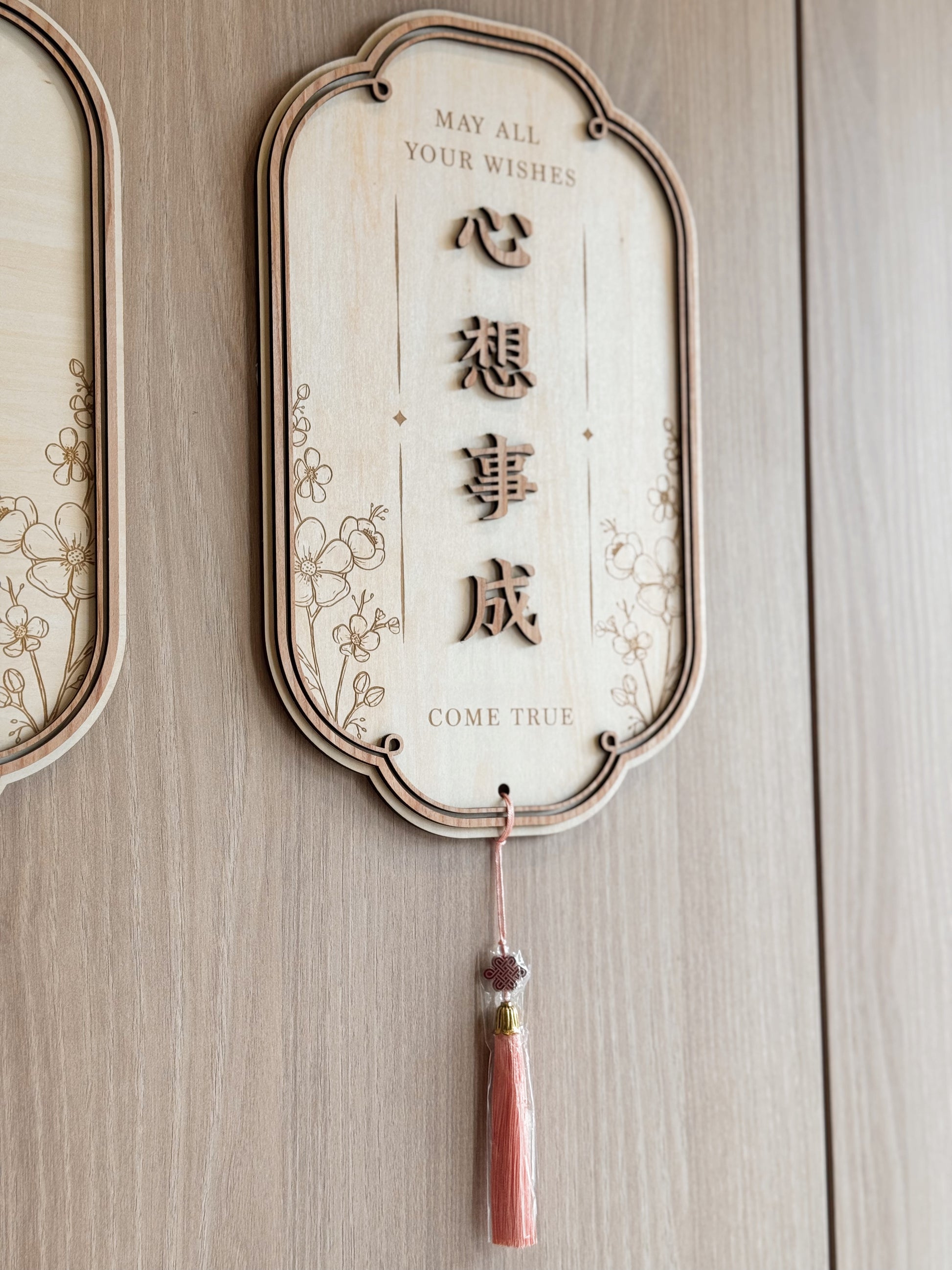 Welcome luck and warmth into your home with this elegant wooden wall plaque. Crafted from layered wood and delicately engraved with floral accents, each carrying timeless blessings.